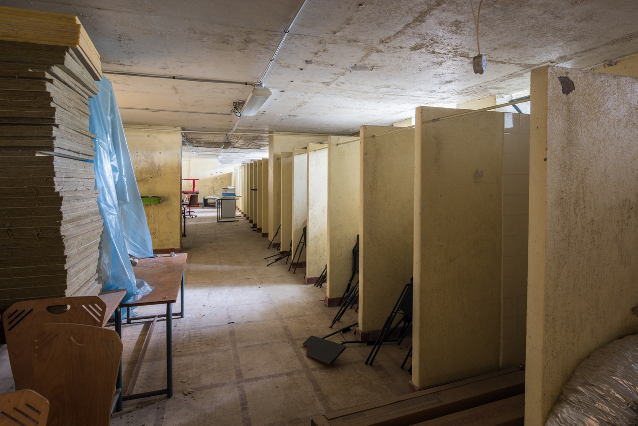 Rangée de douches installée dans le sous-sol lors de la restructuration de l'établissement après la Seconde Guerre mondiale.Immatriculation