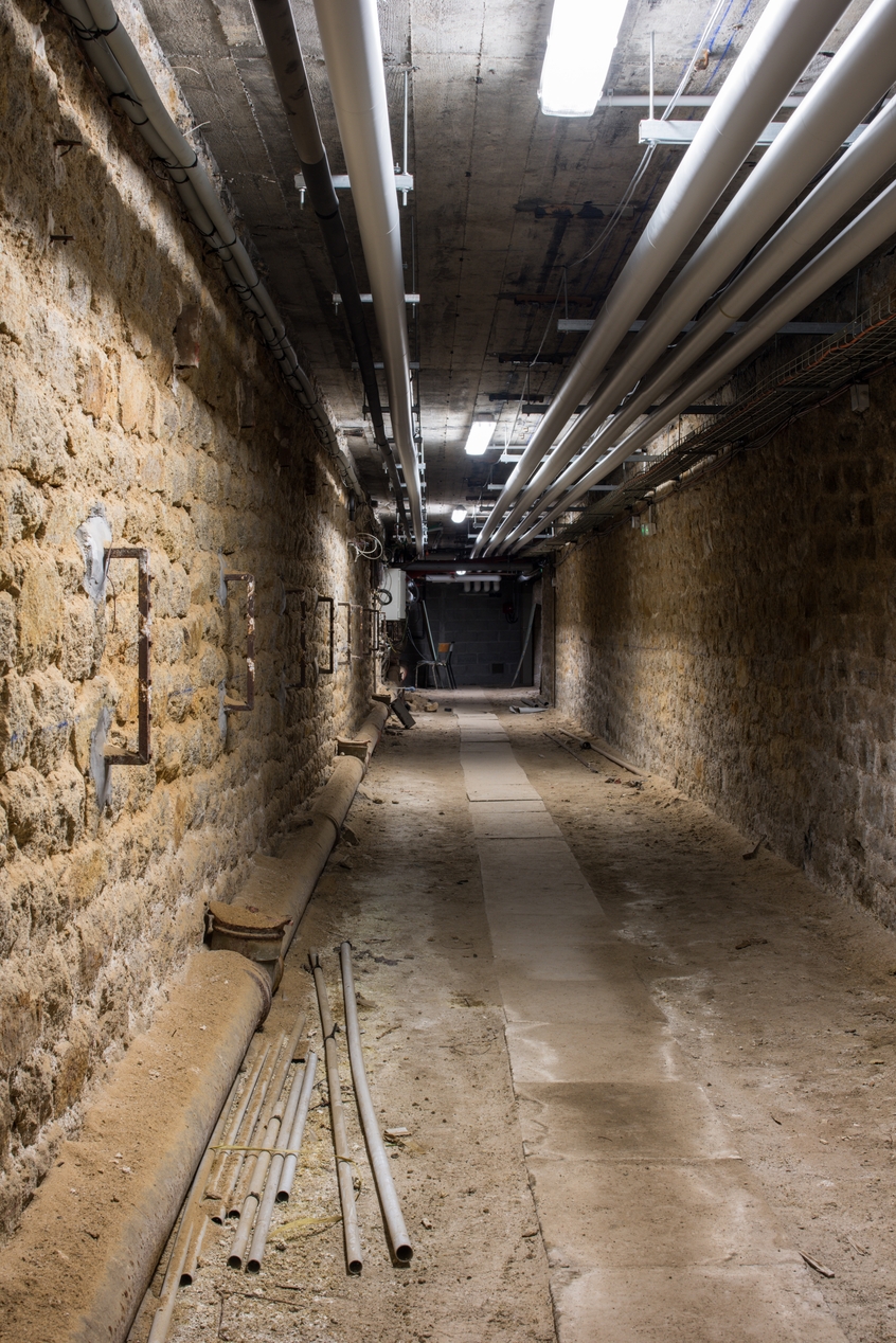 Vue du sous-sol en 2019. Noter l'usage pour les réseaux, le plafond en béton armé et les murs porteurs en granite.Immatriculation