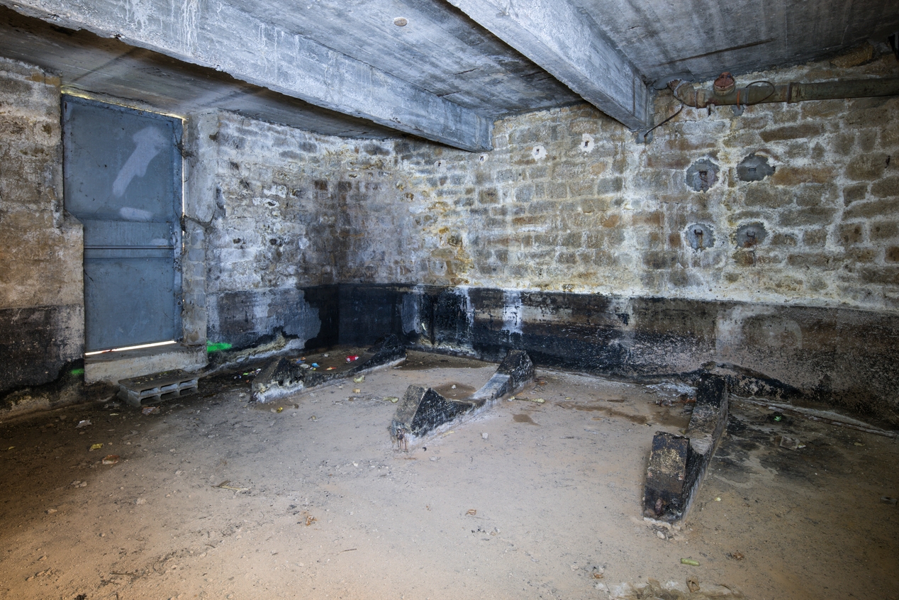 Vue du sous-sol en 2019. Emplacement d'une ancienne cuve ; plafond en béton armé et murs porteurs en granite.Immatriculation