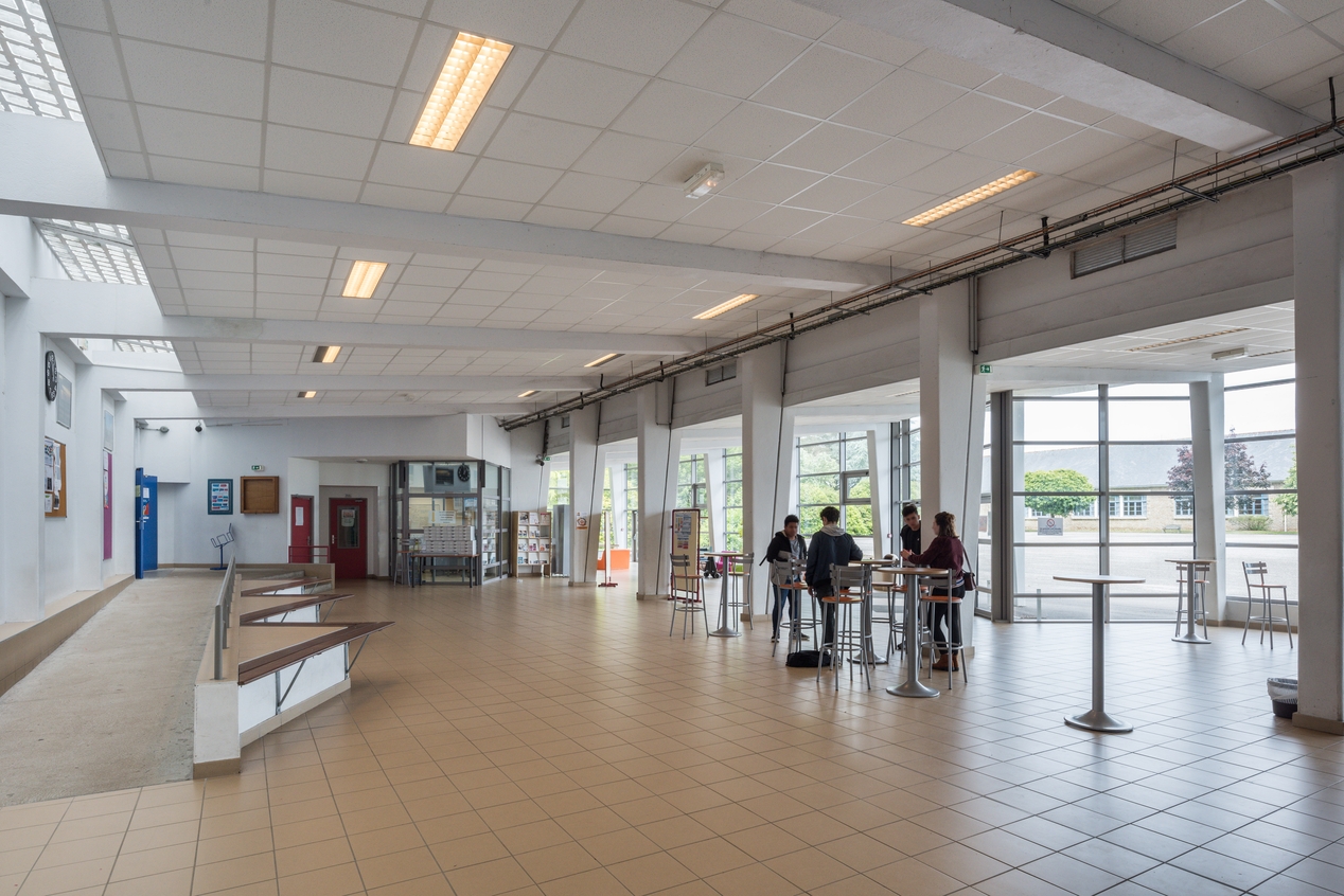 Ancien préau, aujourd'hui vitré. Henri Riedg=berger, architecte 1961. Noter la finesse de la structure en forme d'agrafes, en béton armé.Immatriculation
