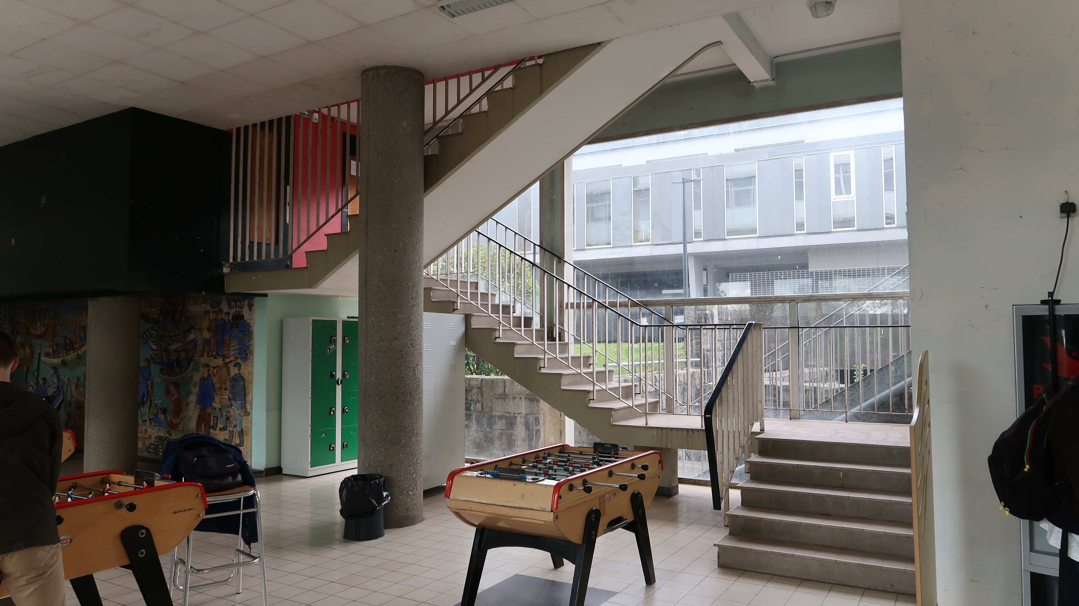 Dans l'internat de 7 étages (D), R. Lopez Architecte, 1958 : un foyer et l'escalier d'accès au restaurant scolaire, avant la construction d'un nouveau service de restauration.Immatriculation