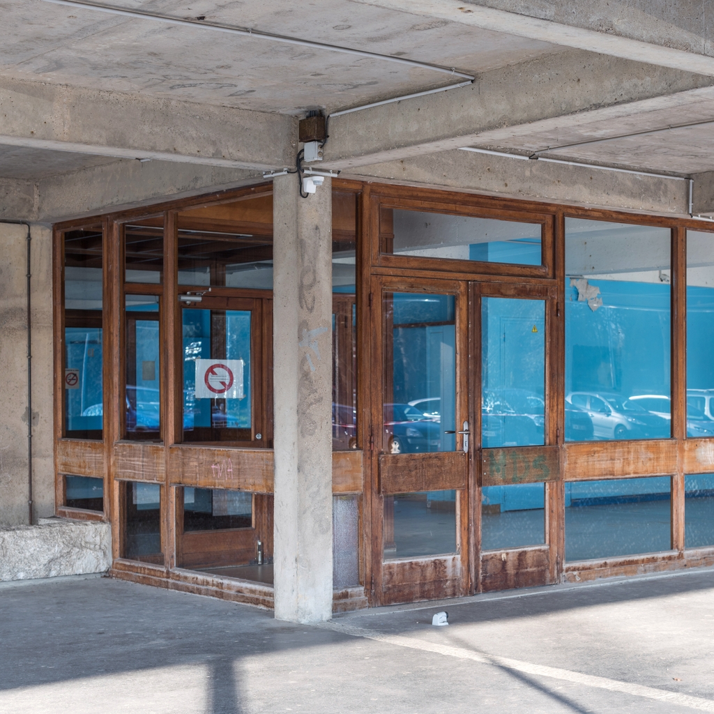 Réfectoire, rez-de-chaussée bas : préau et baies de la galerie d'accès aux wc, et aux escaliers des selfs et des salles de restauration.Immatriculation