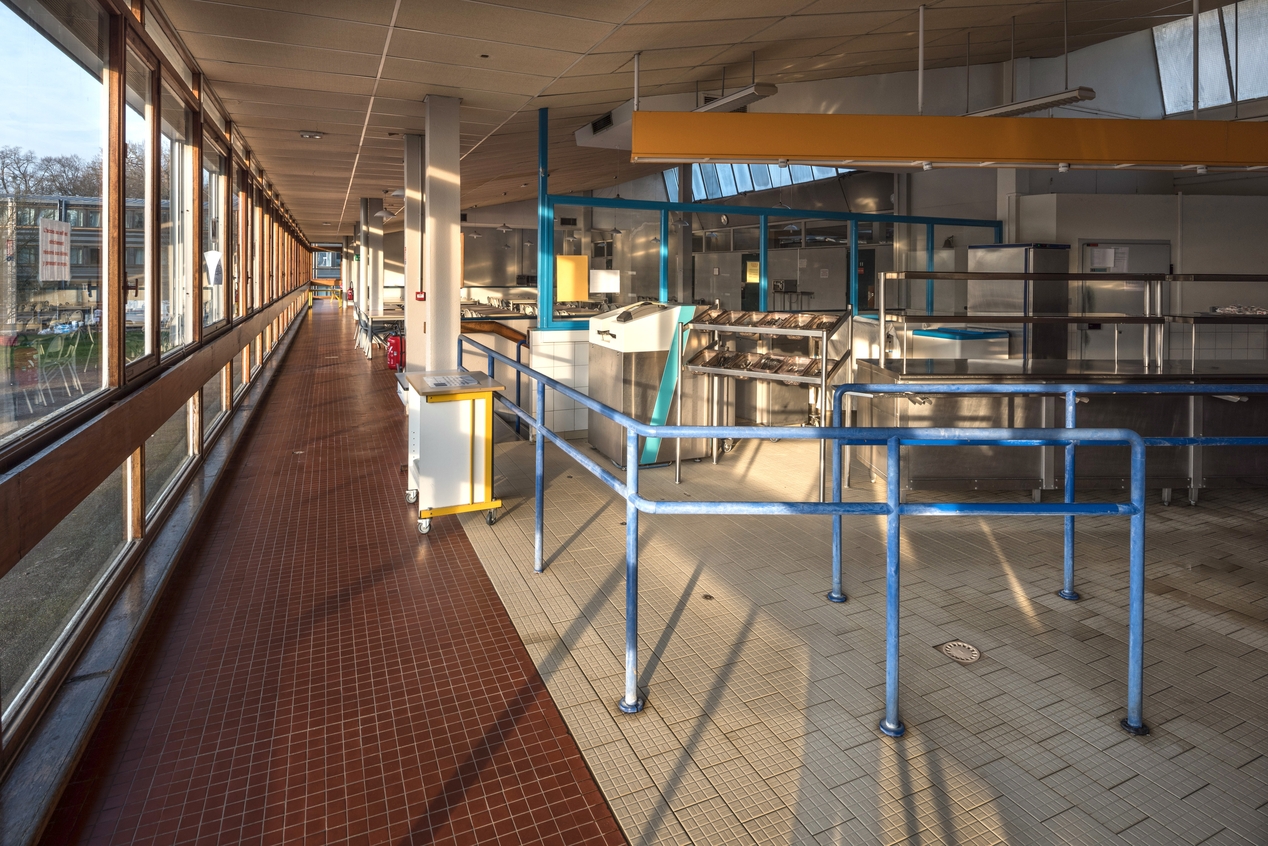 Réfectoire, rez-de-chaussée haut, vue prise le long de la façade ouest. A droite, une ligne de self.Immatriculation