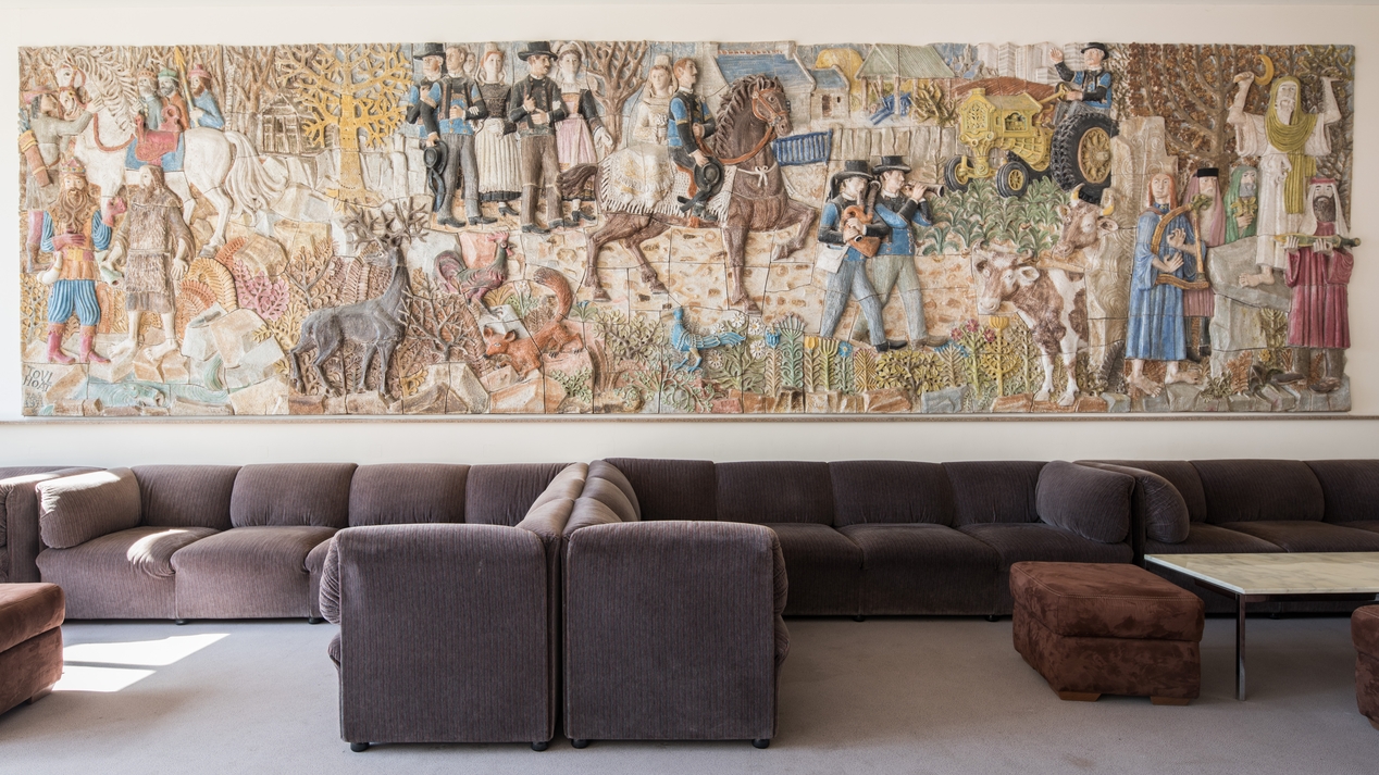 Pierre Toulhoat, "Argoat", bas-relief en céramique de Quimper (1971). Prévu à l'origine pour décorer le lycée Brizeux, il a finalement été installé dans le foyer de l'hôtel des assemblées du Conseil régional de Bretagne.Immatriculation