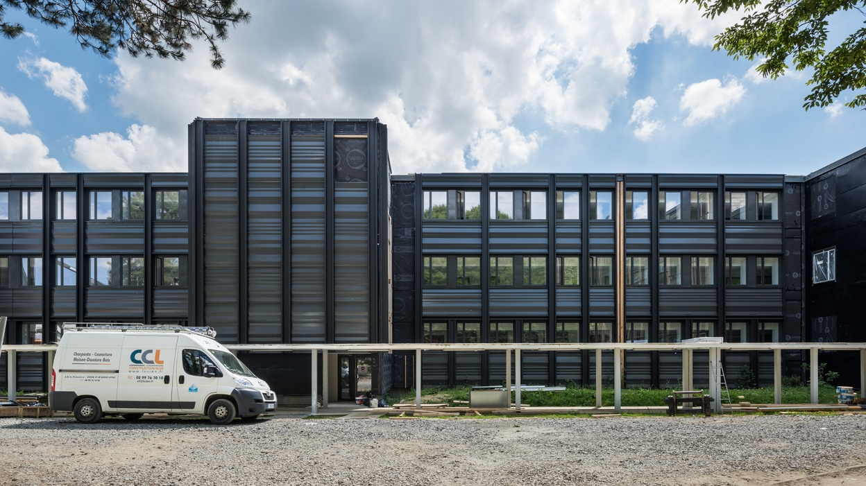 Travaux d'isolation extérieure er création d'un nouvel escalier, bâtiment C, façade nord. Groupe Legendre, architecte : Anthracite 2.0Immatriculation