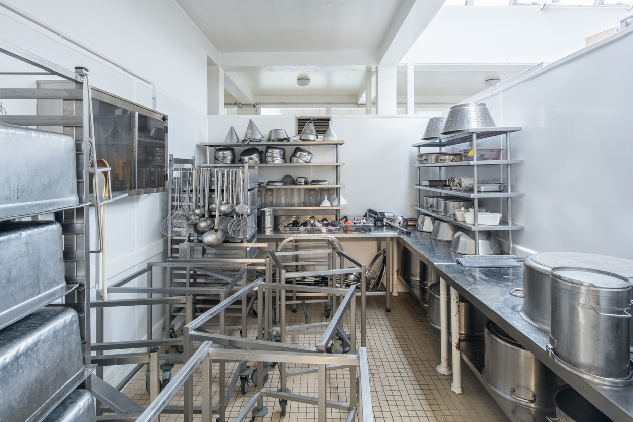 Vue intérieure des cuisines : espace de stockage des ustensiles.Immatriculation