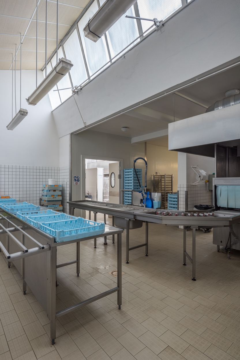 Vue intérieure des cuisines : plonge et baies du lanternon.Immatriculation