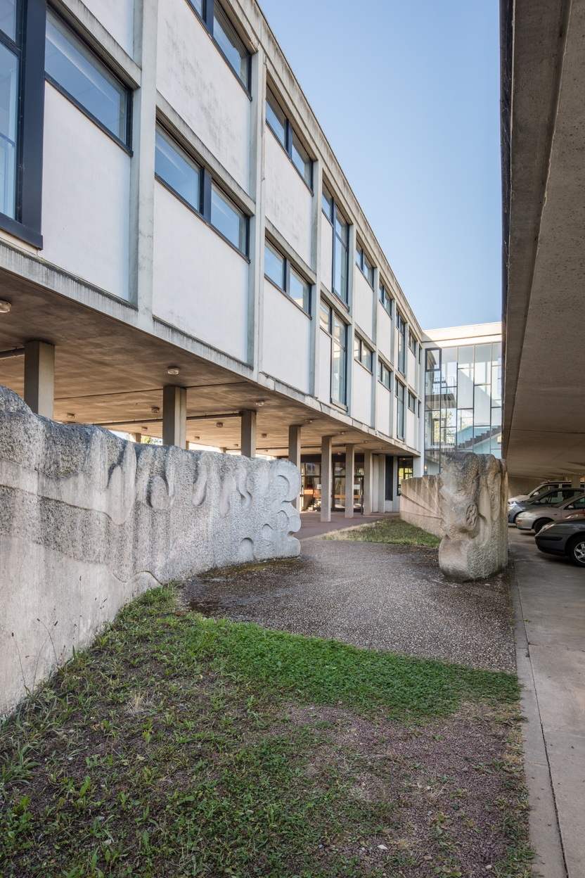 Sculpture de Yazuo Mizui (1976), en pierre de Vassens, formant brise-vent pour le préau (à gauche) et dallage d'accompagnement en galets. A gauche, abri à bicyclettes.Immatriculation