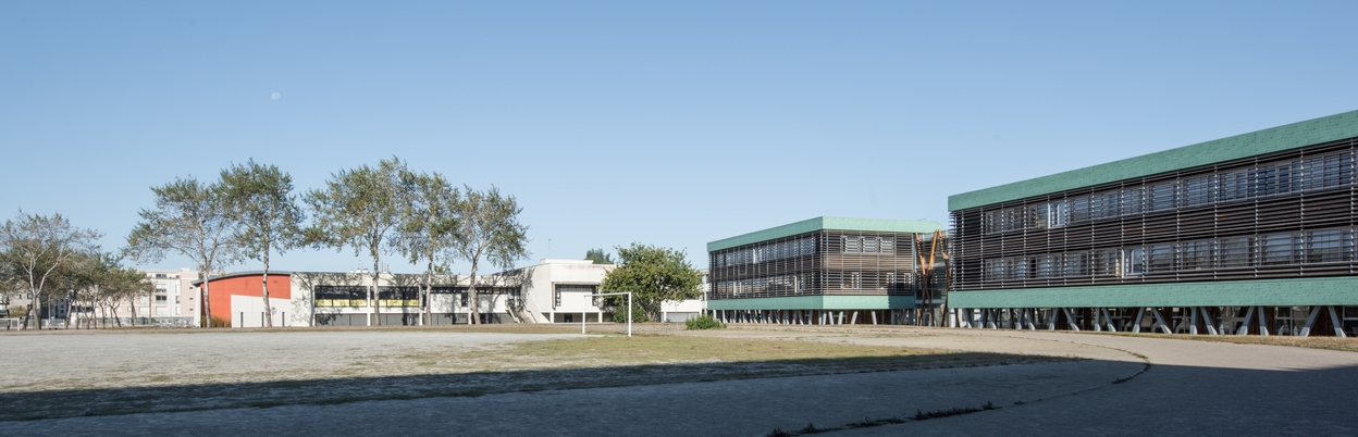 Façade sud de l'espace sciences (bâtiments B2 et B3), Thierry Soquet, architecte, 2015. A gauche, le gymnase, à droite, l'inetrnat de garçons (bâtiment D) et façade est du gymnase.Immatriculation