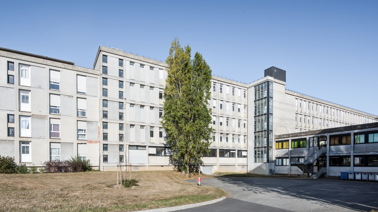 Façade est de l'internat de garçons, logements et infirmerie (bâtiment D). En retour d'équerre, foyer et externat (bâtiment E). Vue prise du sud est). Louis Arretche et Jean Lemercier, architectes, 1967Immatriculation