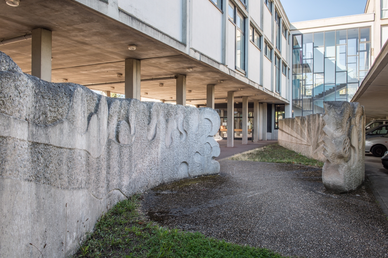 Sculpture de Yazuo Mizui (1976), en pierre de Vassens, formant brise-vent pour le préau (à gauche) et dallage d'accompagnement en galets.Immatriculation