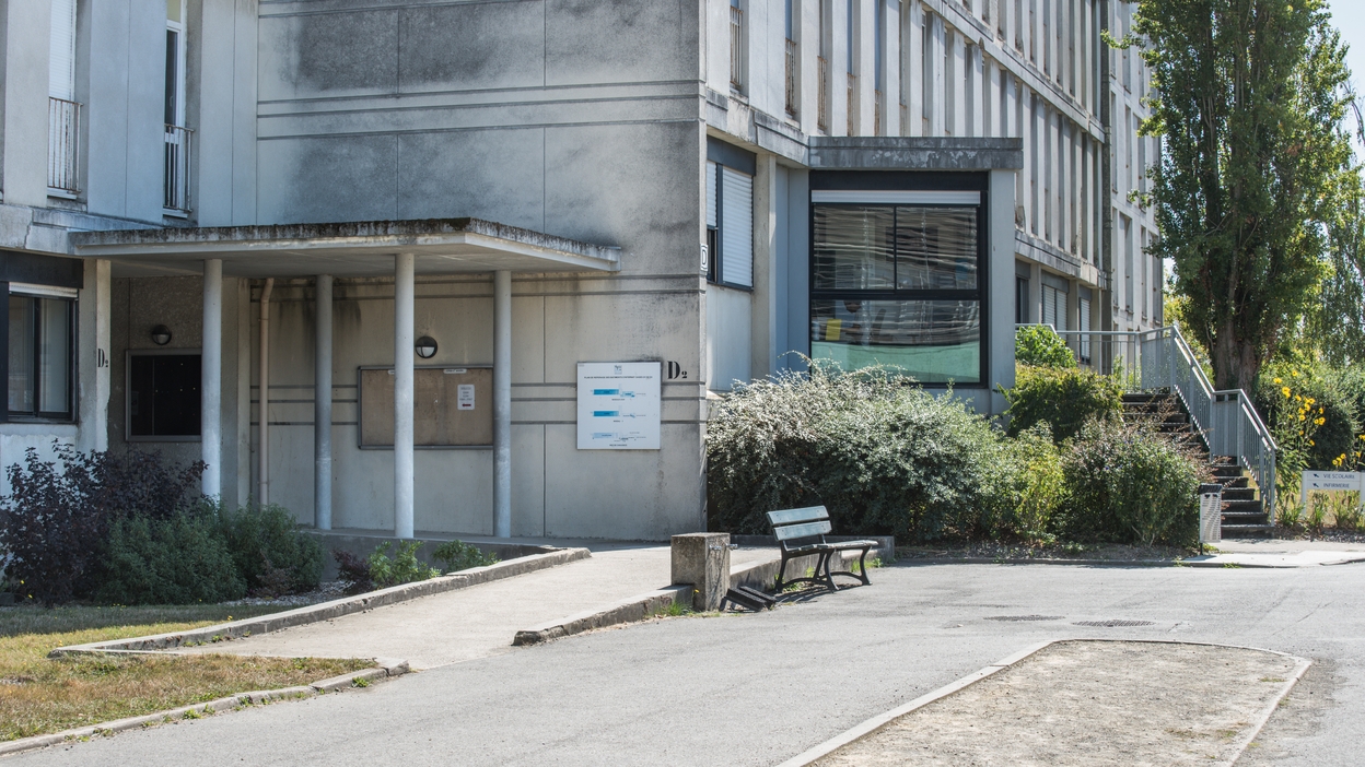 Bâtiment D, internat de garçons, transition entre deux des parties de la "barre". Louis Arretche et Jean Lemercier, architectes, 1967.Immatriculation