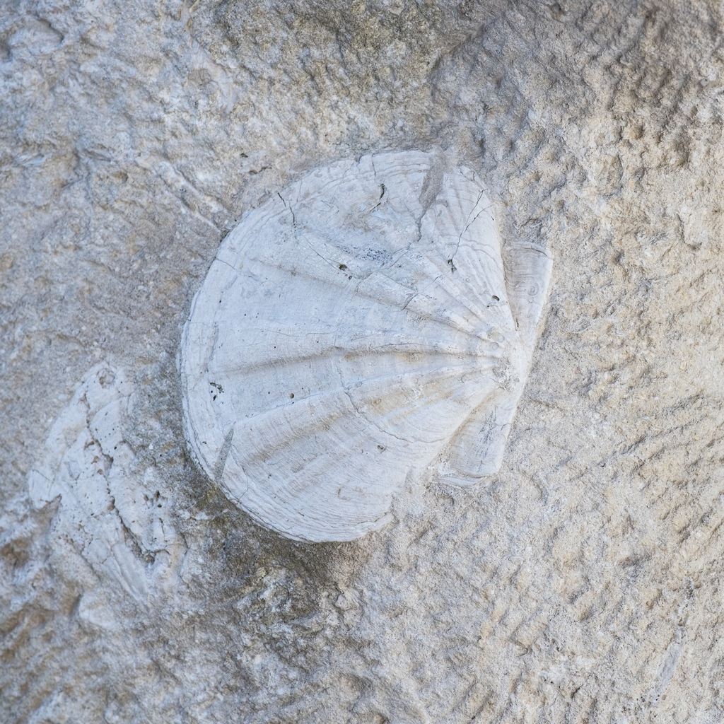 Détail sur un fossile : sculpture de Yazuo Mizui en pierre de Vassens (1976), faisant partie de la série des "murs des fossiles".Immatriculation