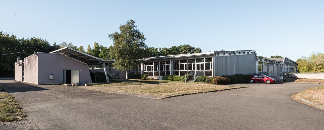 Restauration scolaire mutualisé (avec le collège Les Gayeulles et le lycée Chateaubriand) : vue d'ensemble prise du nord-est. Jean Monge, architecte, plans 1962.Immatriculation