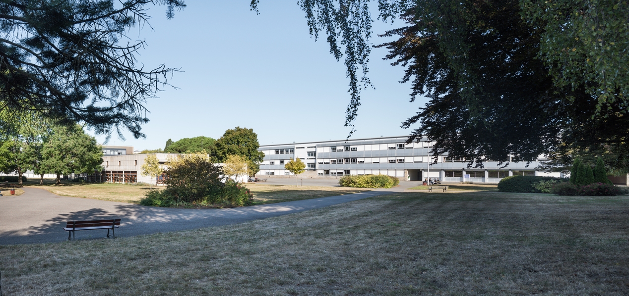 Vue d'ensemble. Bâtiment D, externat : façade sud. Louis Arretche et Jean Monge, architectes, plans 1959. Au premier plan, à gauche, le CDI.Immatriculation