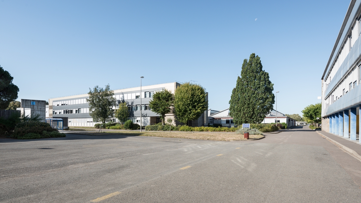 Vue d'ensemble : bâtiment C, externat sciences, ateliers, façades est. Vue prise le long de la façade sud de l'externat. Louis Arretche et Jean Monge, architectes, plans 1959. A gauche, bâtiment E, CDI : entrée.Immatriculation