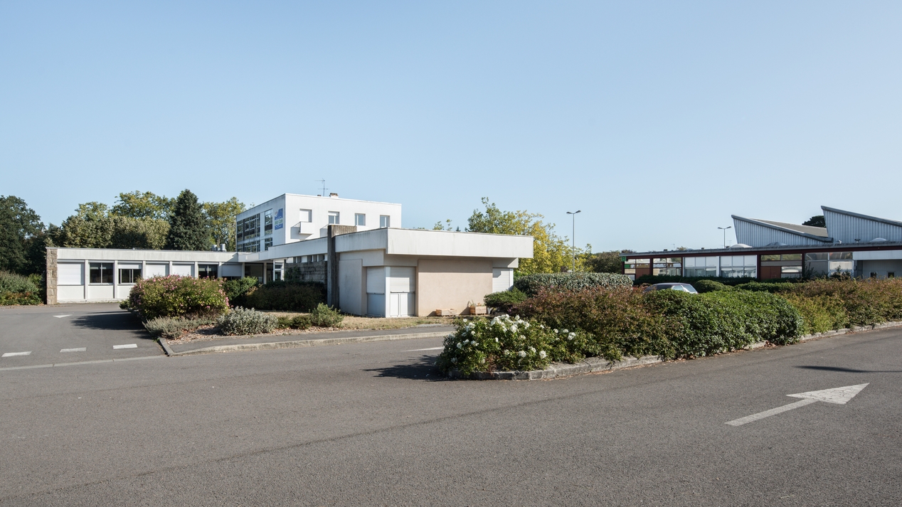 Vues d'ensemble prise du sud-ouest : bâtiment A : accueil, administration, logements ; à droite, façade ouest des ateliers. Louis Arretche et Jean Monge, architectes, plans 1959.Immatriculation