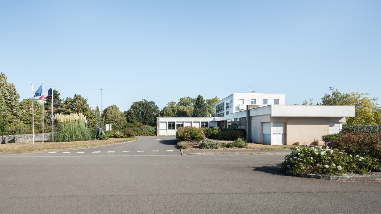 Bâtiment A : accueil, administration, logements, vue d'ensemble prise du sud. Louis Arretche et Jean Monge, architectes, plans 1959. A droite : "Allégresse", sculpture en bonze de Francis Pellerin, décoration du lycée au titre du 1% artistique (1962).Immatriculation