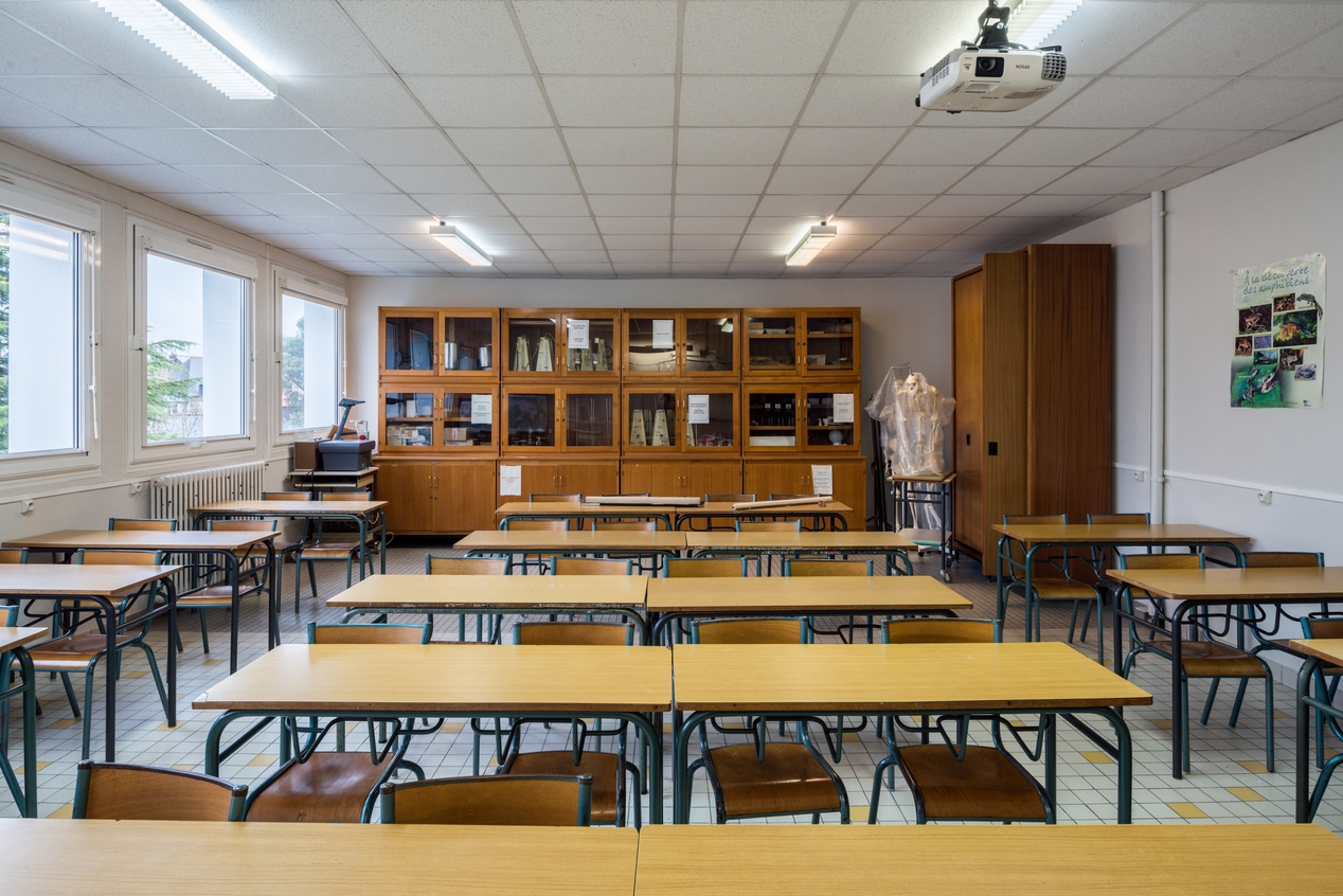Une salle de sciences, son mobilier pour ranger les collections pédagogiques et un squelette.Immatriculation
