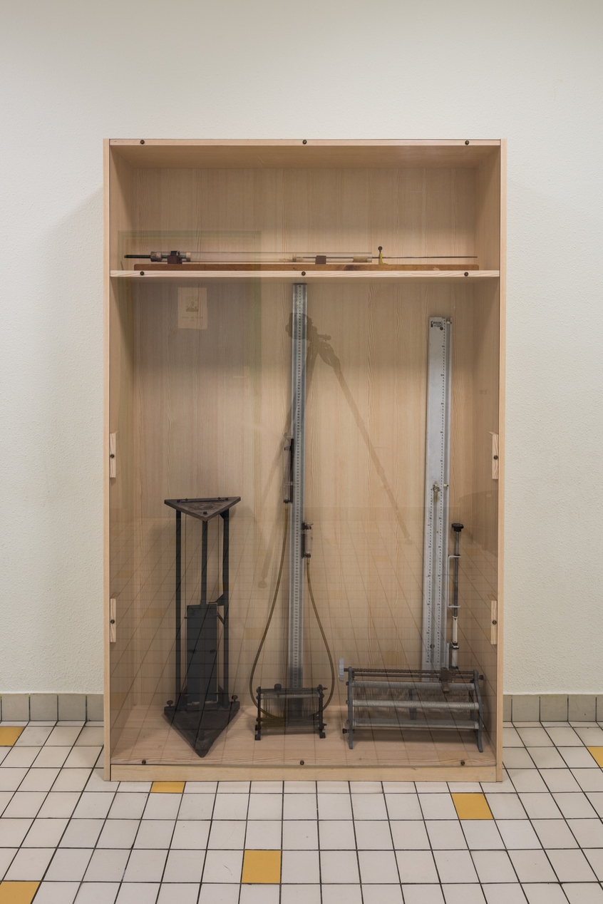 Une partie des collections pédagogiques : tube de Kundt (?), appareil chute libre d’une plaque, rhéostats.Immatriculation
