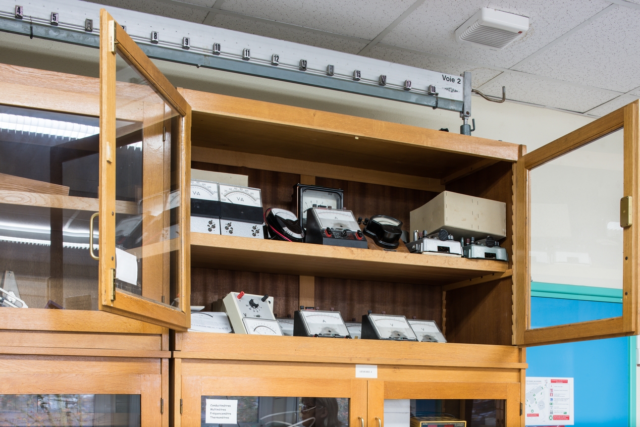 Armoire de rangement des collections pédagogiques, détail : voltmètres.Immatriculation