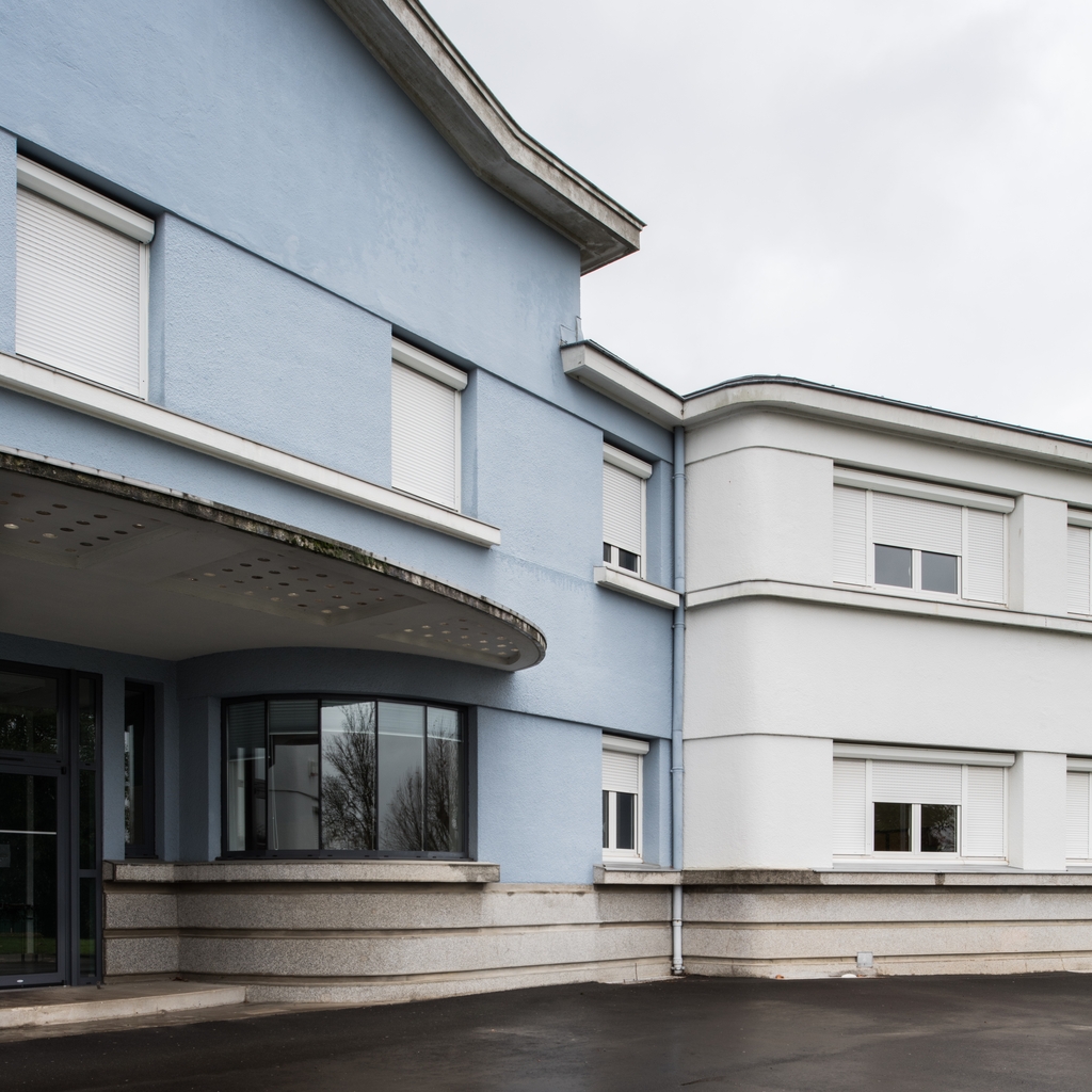 Bâtiment C, actuellement externat : détail sur l'entrée principale et son auvent en béton et pavés de verre ronds.Immatriculation