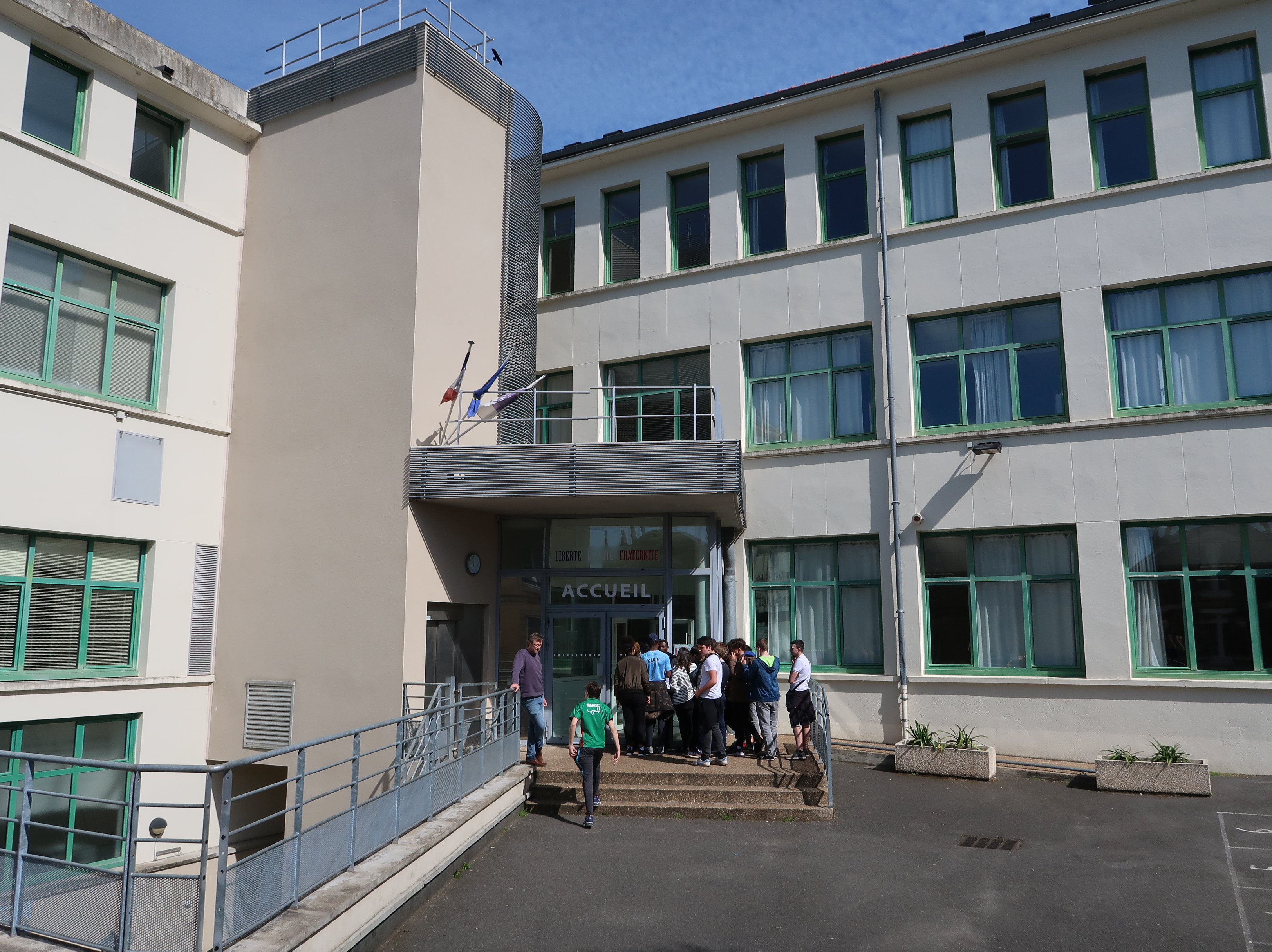 Au nord-ouest de la cour : entrée de l'accueil et escalier de secours.Immatriculation