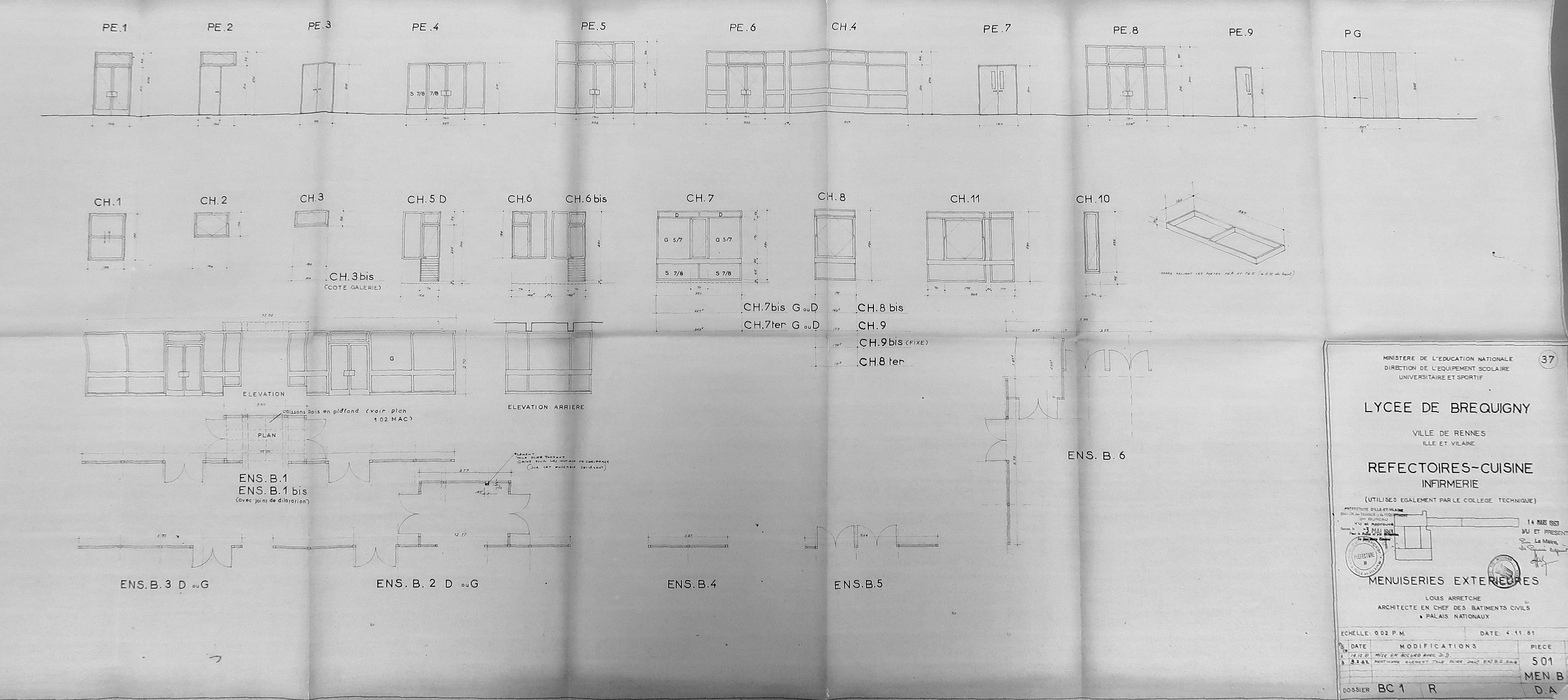 AD 35 : 152W162, Arretche [L.], Lycée de Bréquigny, Réfectoire - cuisine - infirmerie, élévations et coupes, 1961.