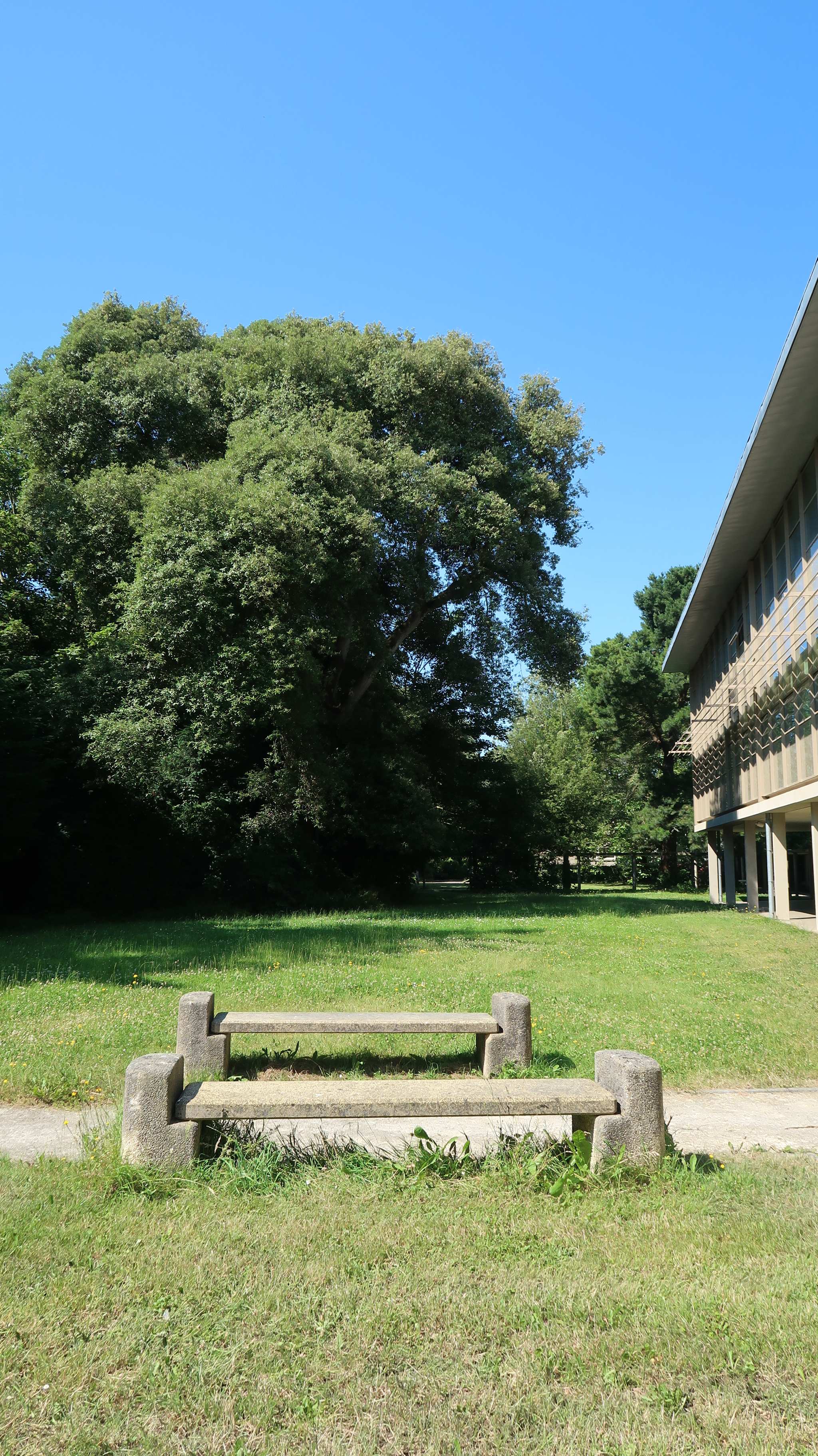 Mobilier dans le parc. A droite, façade sud du bâtiment O.Immatriculation