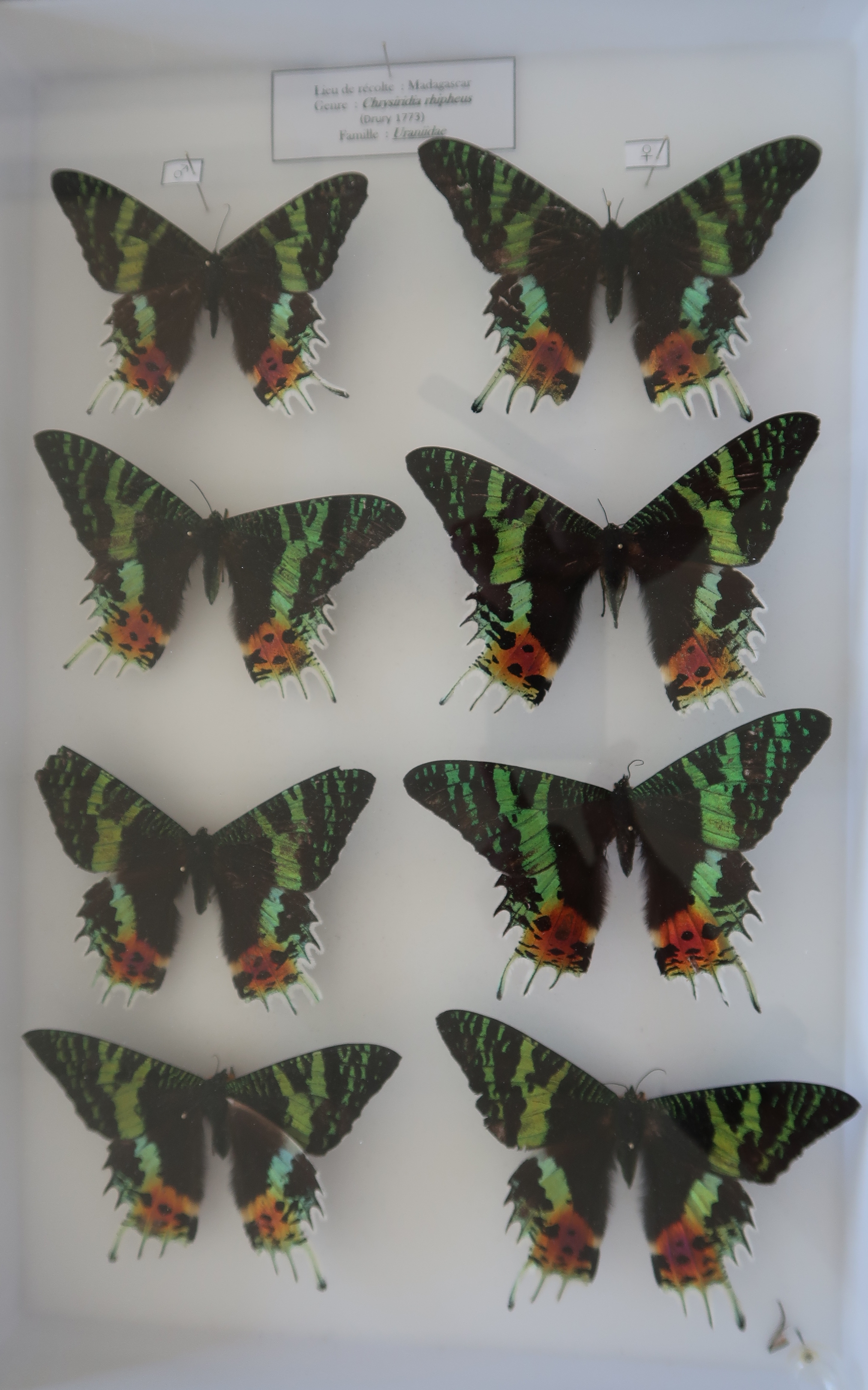 Élément des collections de sciences naturelles, papillons Chrysiridia rhipheus de Madagascar.Immatriculation
