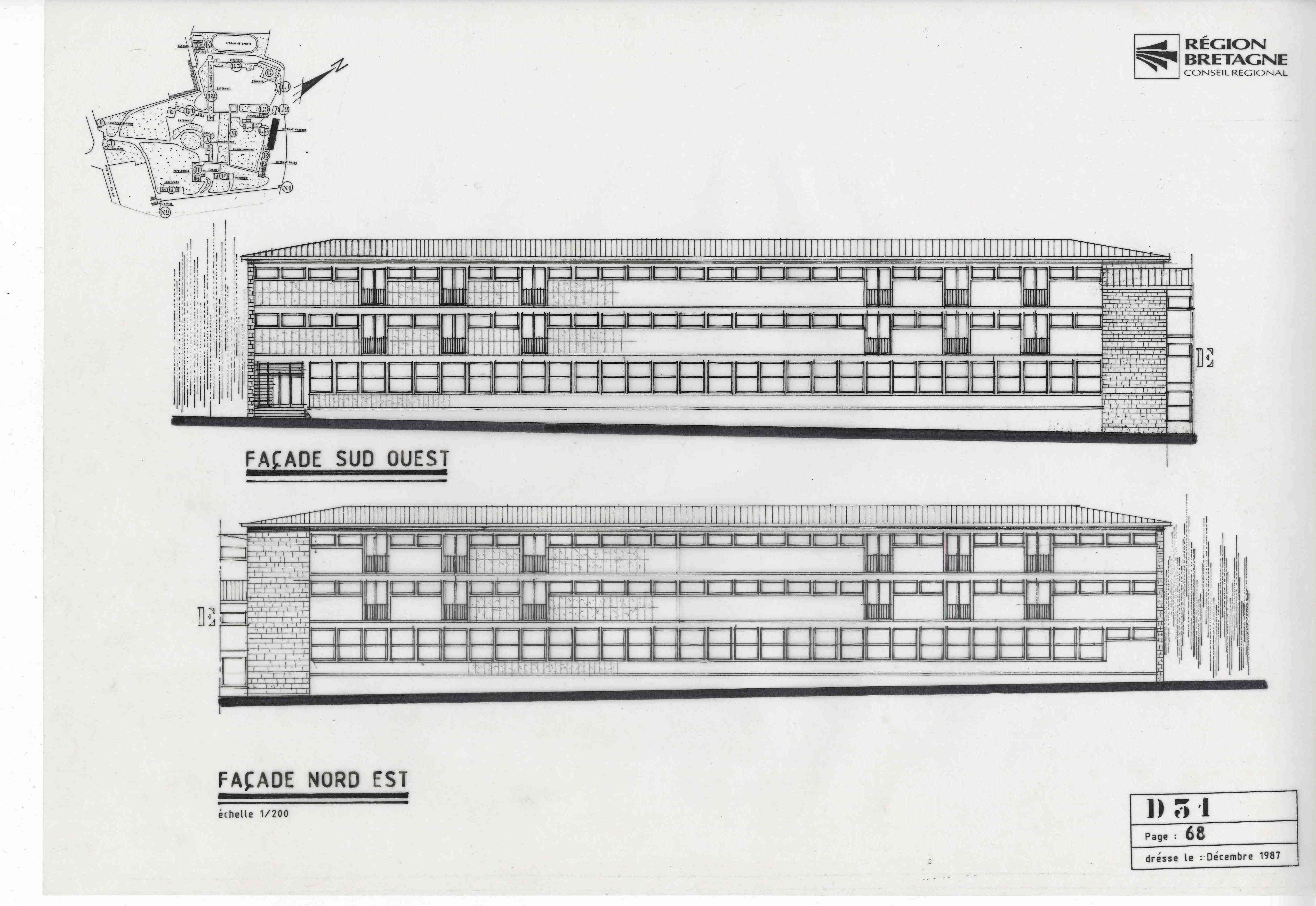 Archives de la direction de l'immobilier et de la logistique du Conseil régional de Bretagne : non coté. Lycée Jacques Cartier. État actuel. Jacques Salmon, décembre 1987.