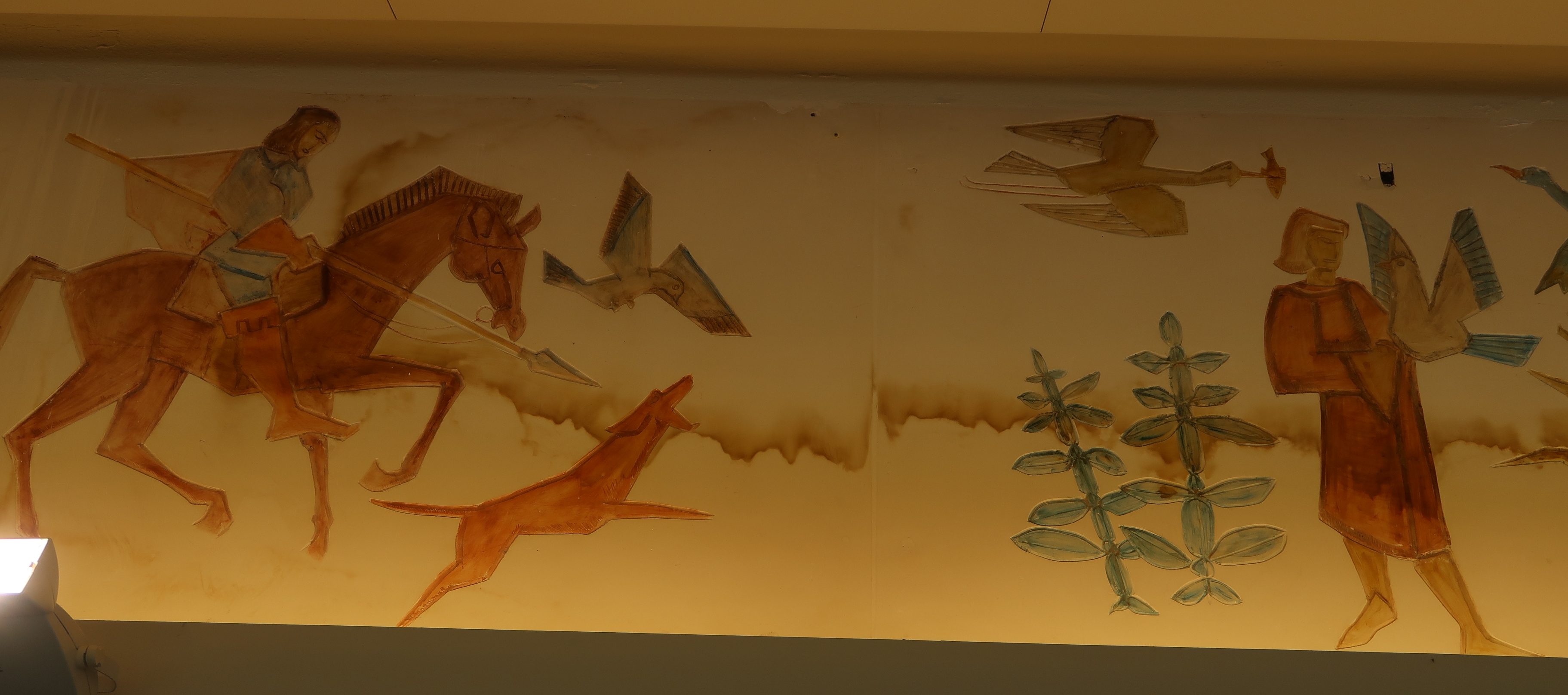 Frise en plâtre, gravée et modelée sur le plan de surface polychrome laquée de 36 m2 environ : détail.Immatriculation