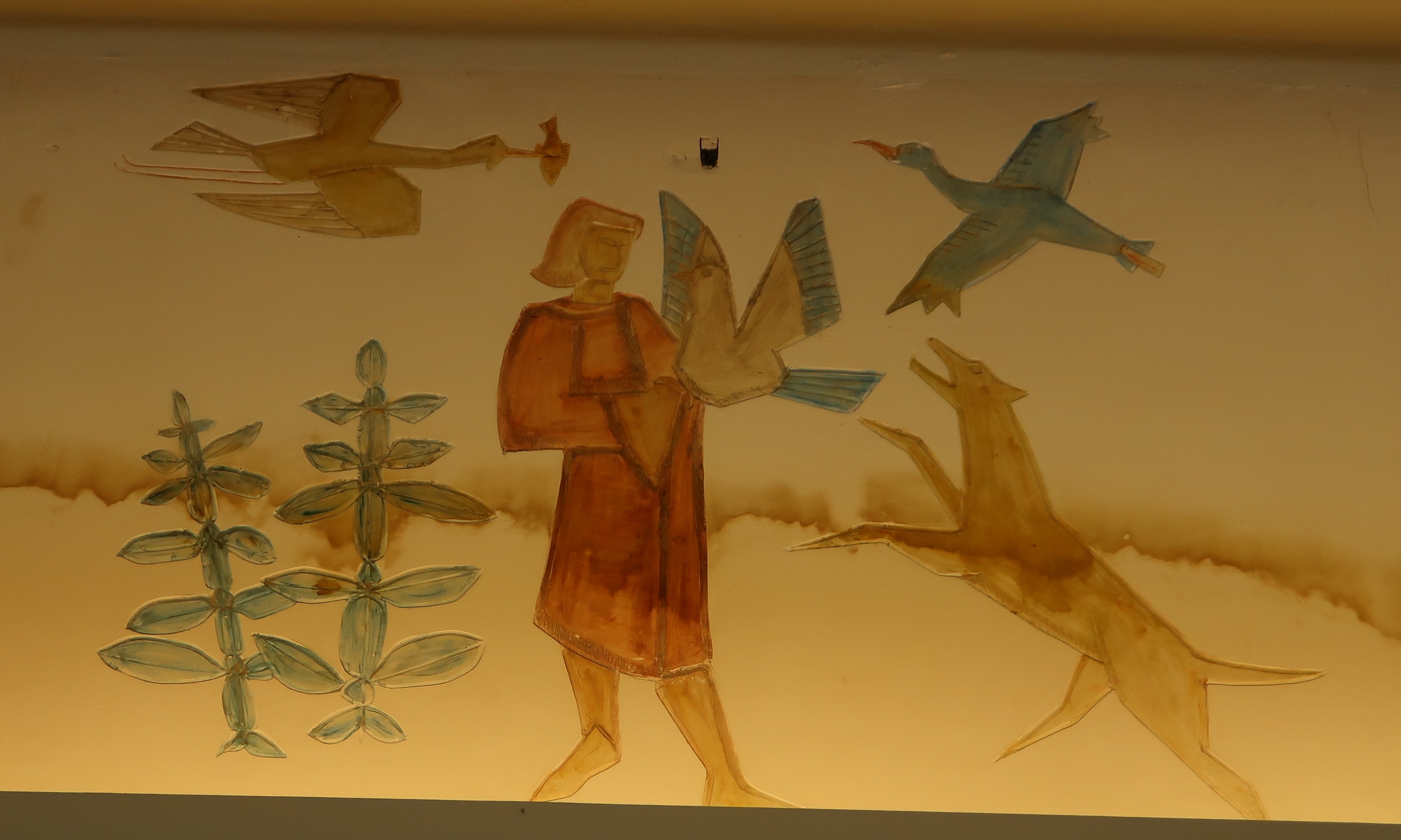 Frise en plâtre, gravée et modelée sur le plan de surface polychrome laquée de 36 m2 environ : détail.Immatriculation