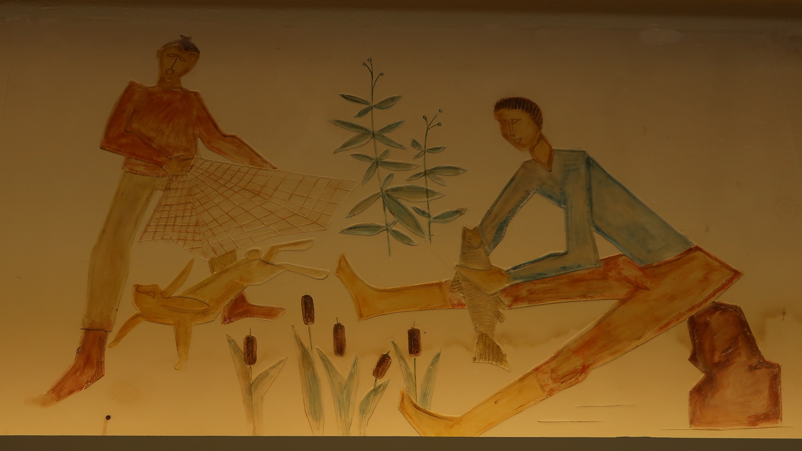 Frise en plâtre, gravée et modelée sur le plan de surface polychrome laquée de 36 m2 environ : détail.Immatriculation