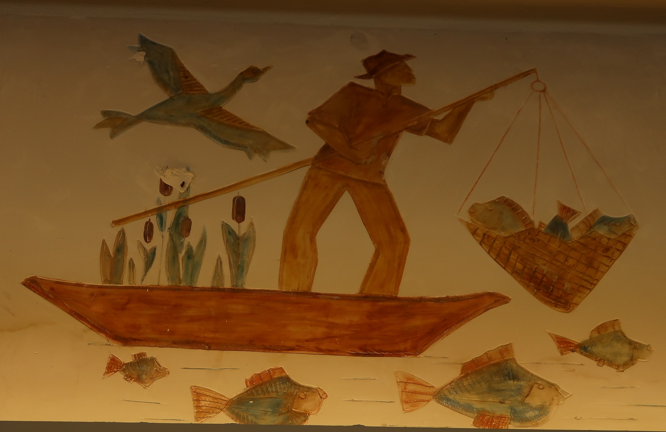Frise en plâtre, gravée et modelée sur le plan de surface polychrome laquée de 36 m2 environ : détail.Immatriculation