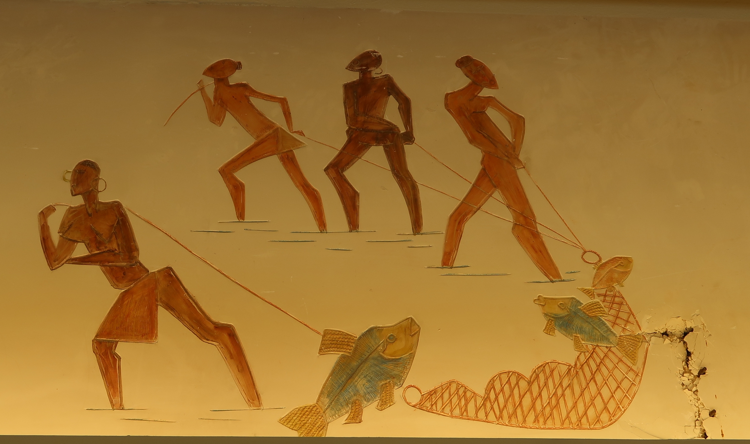 Frise en plâtre, gravée et modelée sur le plan de surface polychrome laquée de 36 m2 environ : détail. Noter les dégradations.Immatriculation