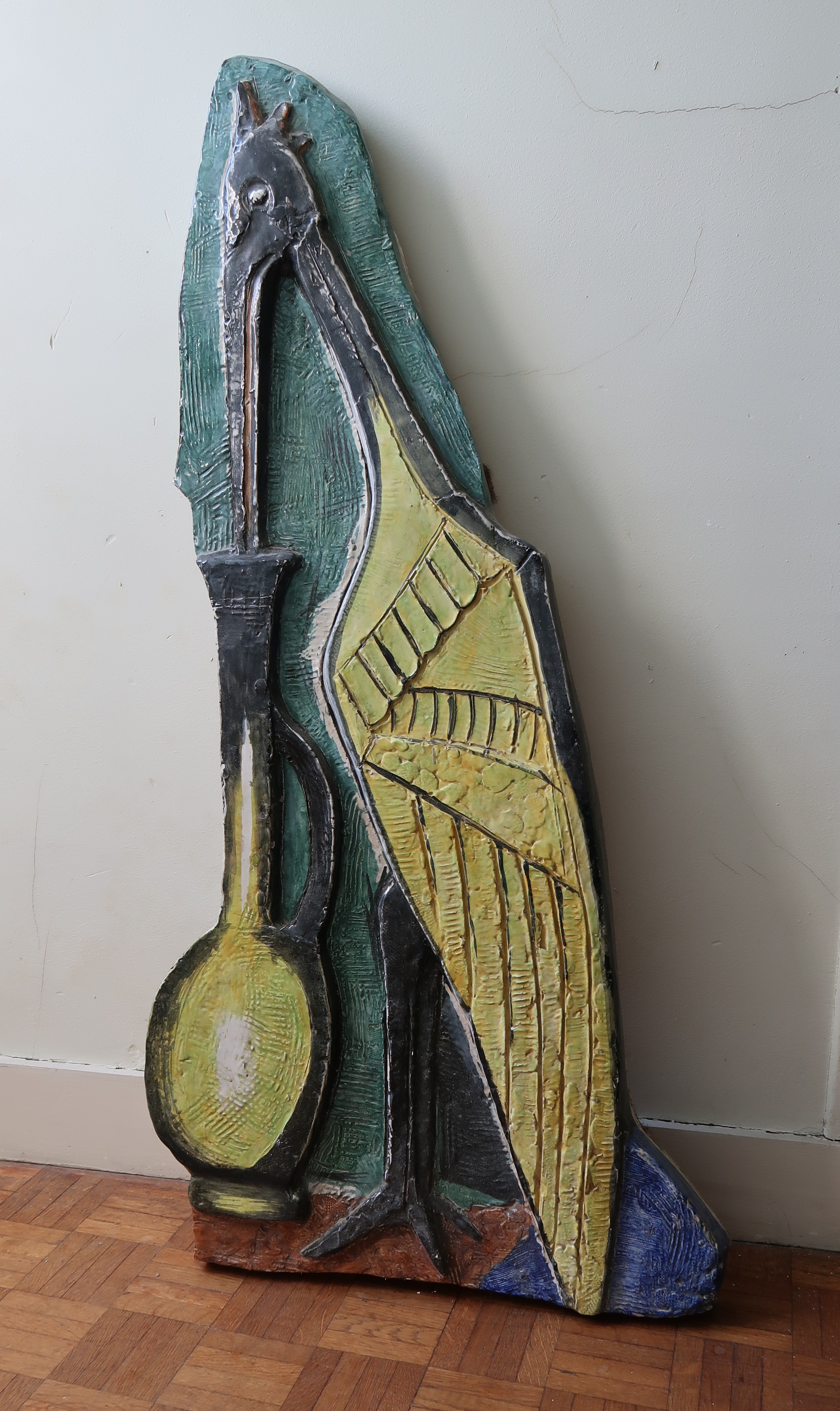 Bas-relief en céramique polychrome d'Antoniucci Volti (en 2019, entreposé dans un grenier de la "malounière").Immatriculation