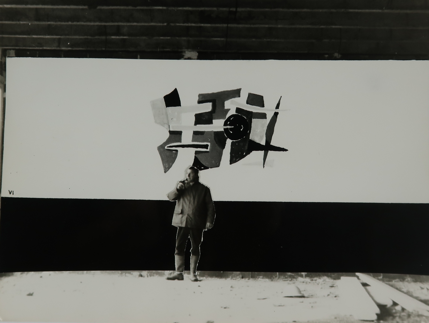 Photomontage : maquette in situ, dans un réfectoire en cours de construction, d'une décoration murale non réalisée, J. Durand-Henriot, ca 1968. On reconnaît le projet "Variation IV".Immatriculation