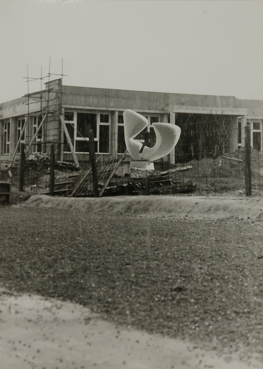 Francis Pellerin, maquette de la sculpture (non réalisée selon cette étude) au titre du 1% artistique, devant le réfectoire, en chantier, du lycée classique et moderne mixte de Fougères, ca. 1968.Immatriculation