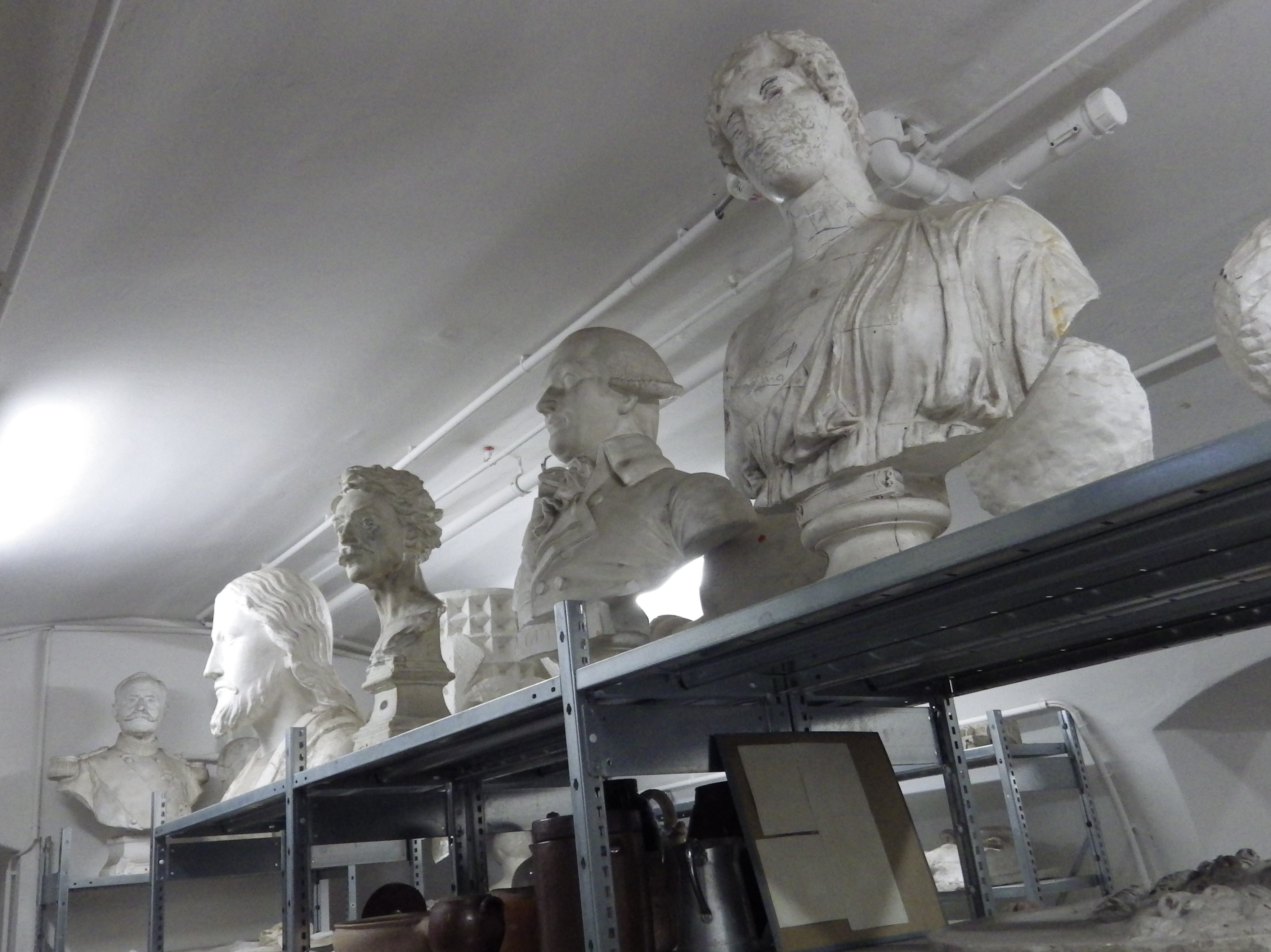 Collection des moulages en plâtre pour l'enseignement du dessin, conservée sur les étagères d'une cave