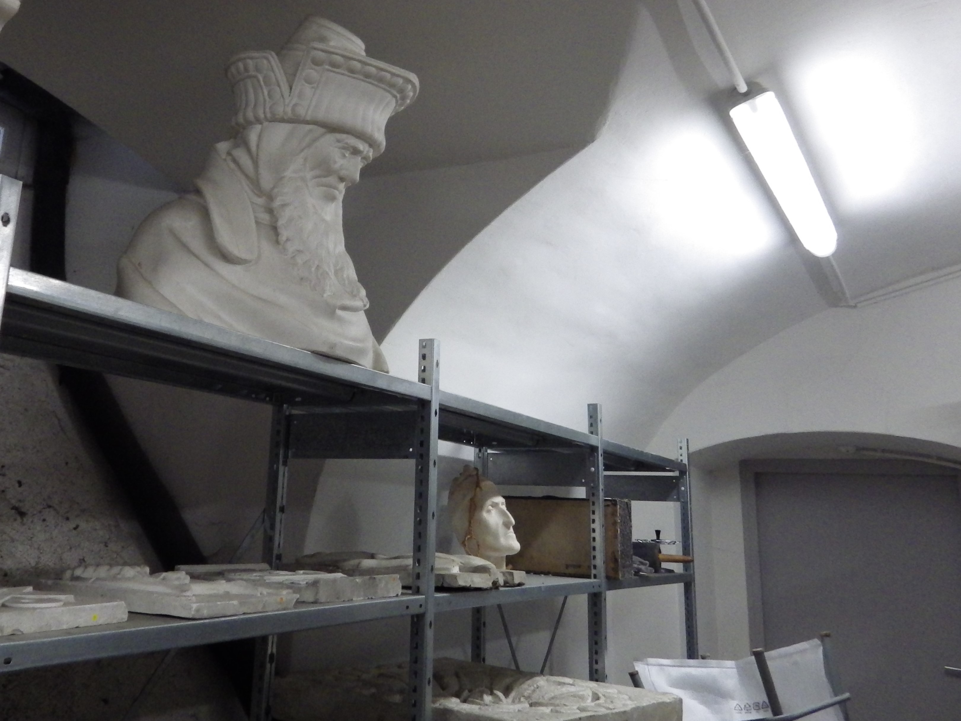 Collection des moulages en plâtre pour l'enseignement du dessin, conservée sur les étagères d'une caveImmatriculation
