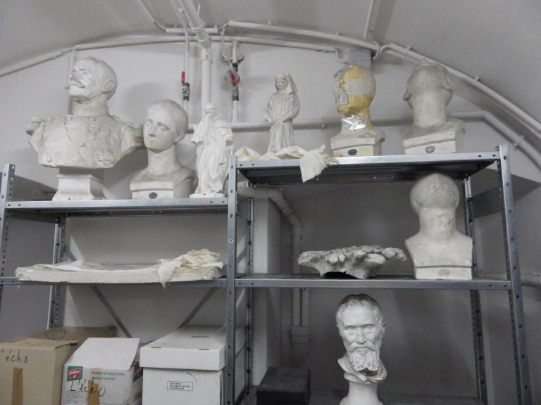 Collection des moulages en plâtre pour l'enseignement du dessin, conservée sur les étagères d'une caveImmatriculation