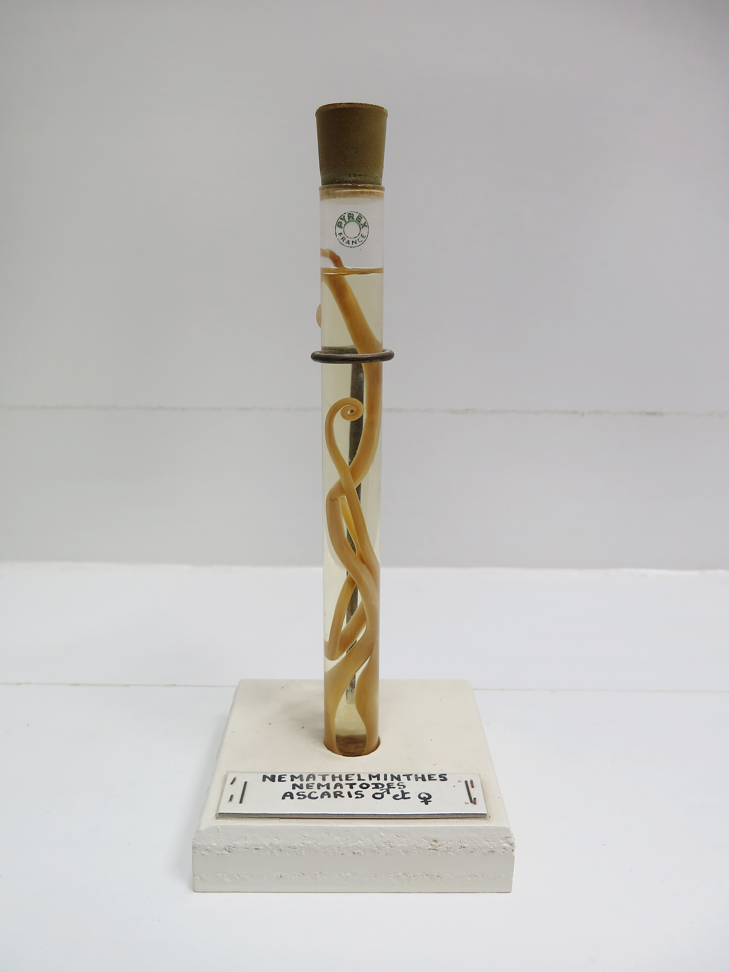 Fiole en verre contenant des ascaris (mâle et femelle) - Zoologie - Embranchement des versImmatriculation
