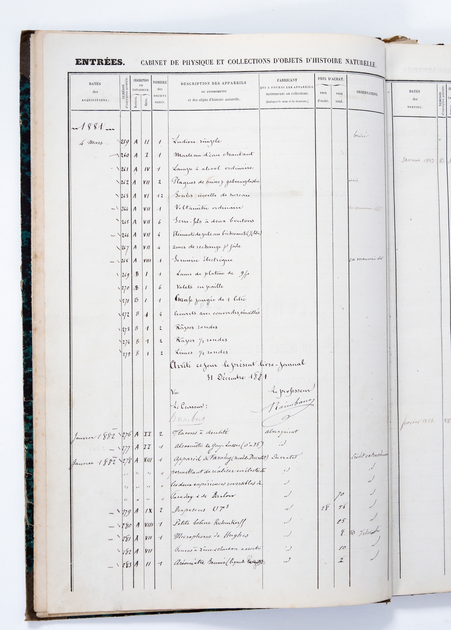 Livre-journal du cabinet de physique et des collections d'objets d'histoire naturelleImmatriculation