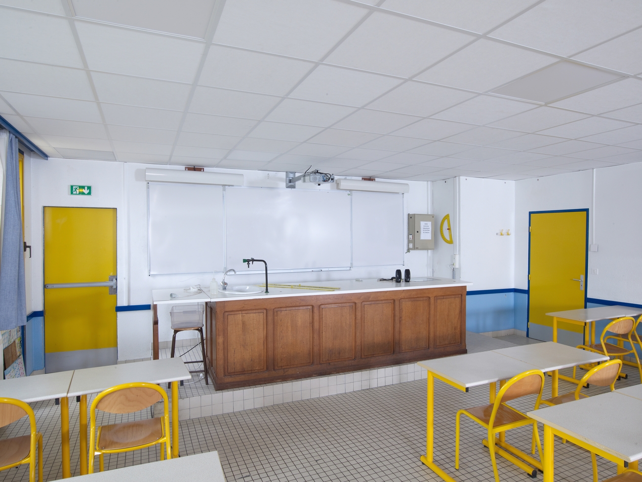 Salle de classe de physique-chimie - Bâtiment N. Une ancienne paillasse a été réutilisée pour le bureau du professeur.Immatriculation