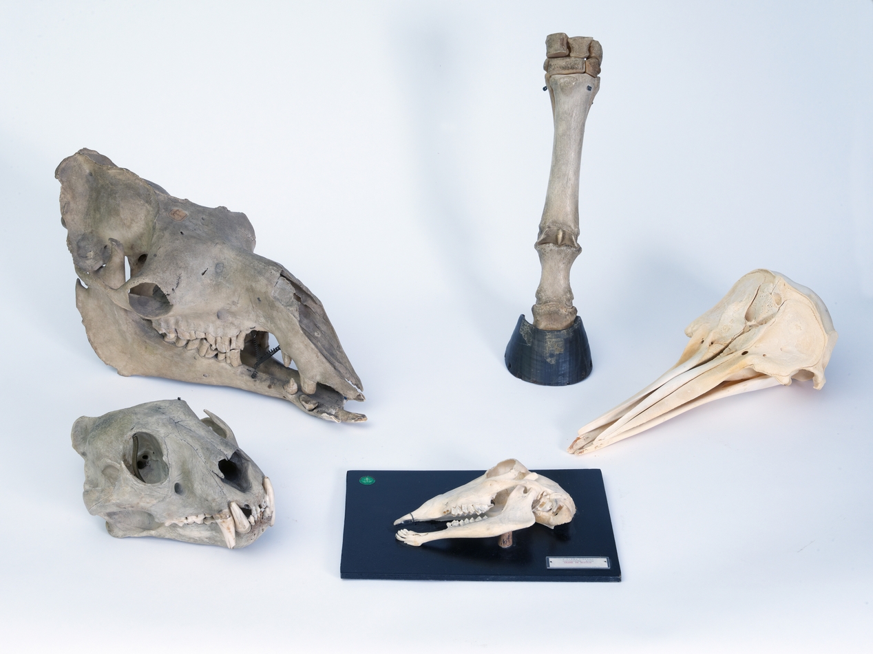 Crâne de cheval, crâne de félin, crâne de dauphin, demi-crâne de mouton et patte de cheval - Zoologie – Embranchement des vertébrés (Non signé)Immatriculation
