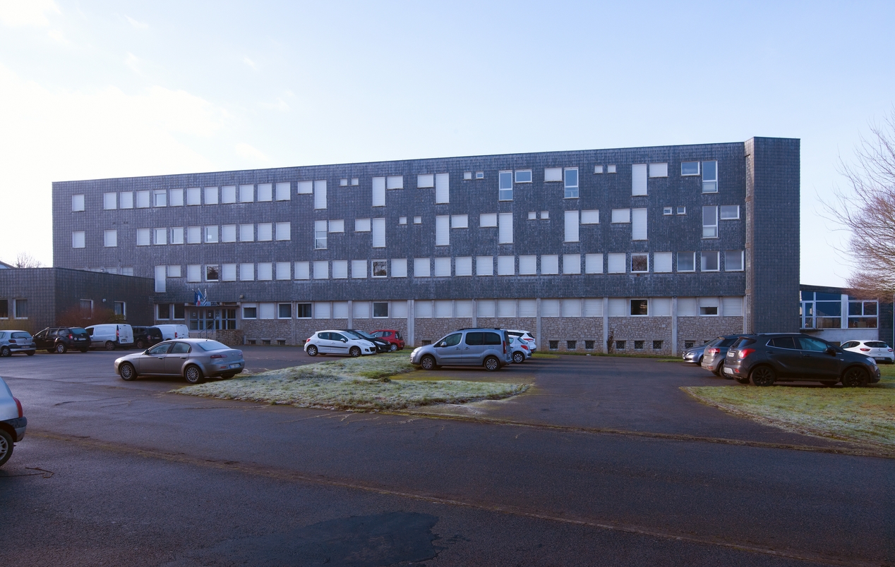Bâtiment A, actuellement internat-restauration, façade nord-est. Les fonctions d'origines du collège agricole féminin (Yves Guillou architecte, 1965), classes aux deux premiers niveaux, chambres aux deux niveaux supérieurs, sont parfaitement lisibles.Immatriculation