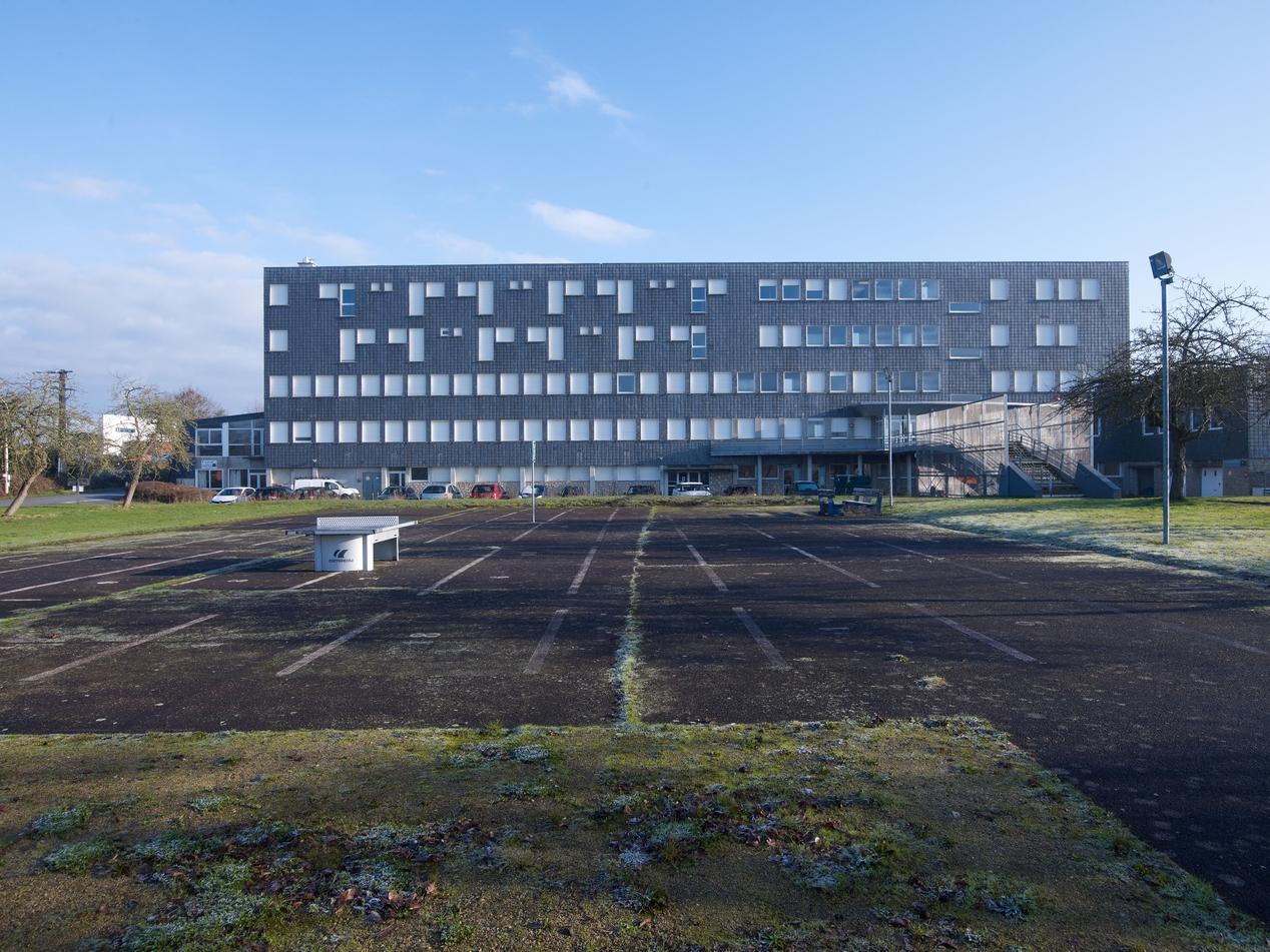 Bâtiment A, actuellement internat-restauration, façade sud-ouest. Les fonctions d'origines du collège agricole féminin (Yves Guillou architecte, 1965), classes aux deux premiers niveaux, chambres aux deux niveaux supérieurs, sont parfaitement lisibles.Immatriculation