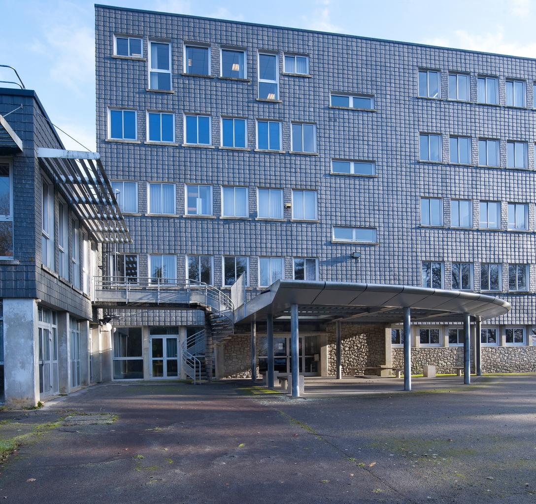 Bâtiment B, actuellement externat-administration), façade sud-ouest, détail sur l'entrée (architectes : Yves Guillou (1963), Hervé l'Hyver (1994) pour la restructuration et le auvent de l'entrée).Immatriculation