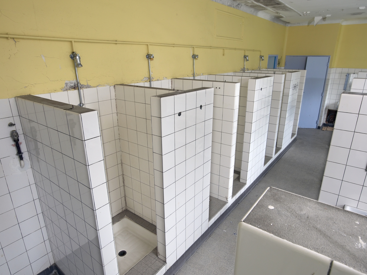 Douches et lavabos, internat de garçons (1954), désaffecté.Immatriculation
